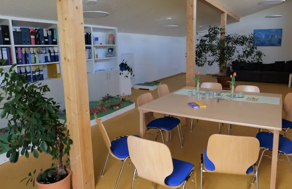Dieser Raum bietet den Fachkräften die Möglichkeit, sich zu treffen, zu planen, zu reflektieren und zusammenzuarbeiten. Er ist nicht nur zu administrativen Zwecken gedacht, sondern auch ein Ort für professionellen Austausch und Weiterbildung. Hier werden Elterngespräche in einer angenehmen und einladenden Atmosphäre geführt. Darüber hinaus wird er auch als Pausenraum genutzt.